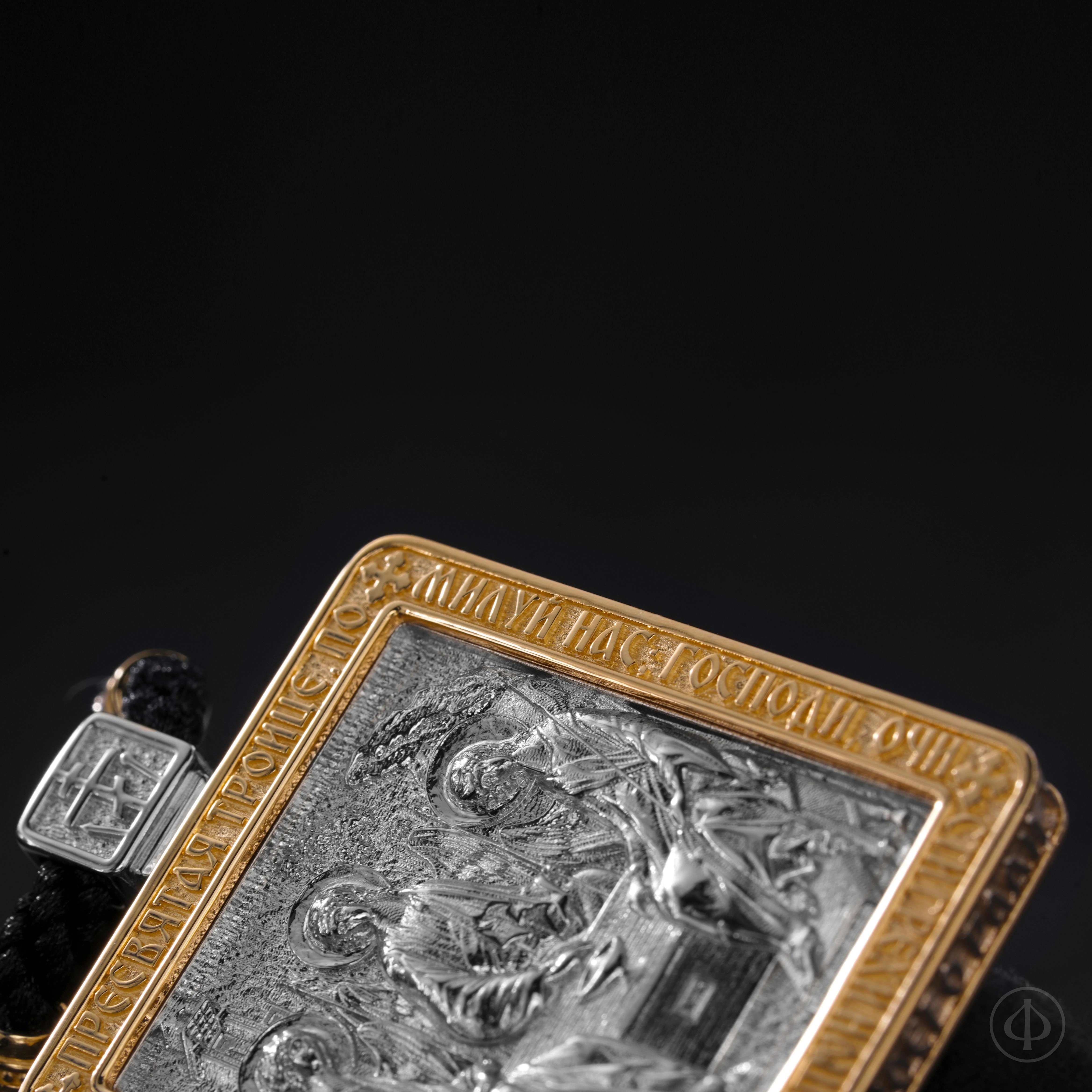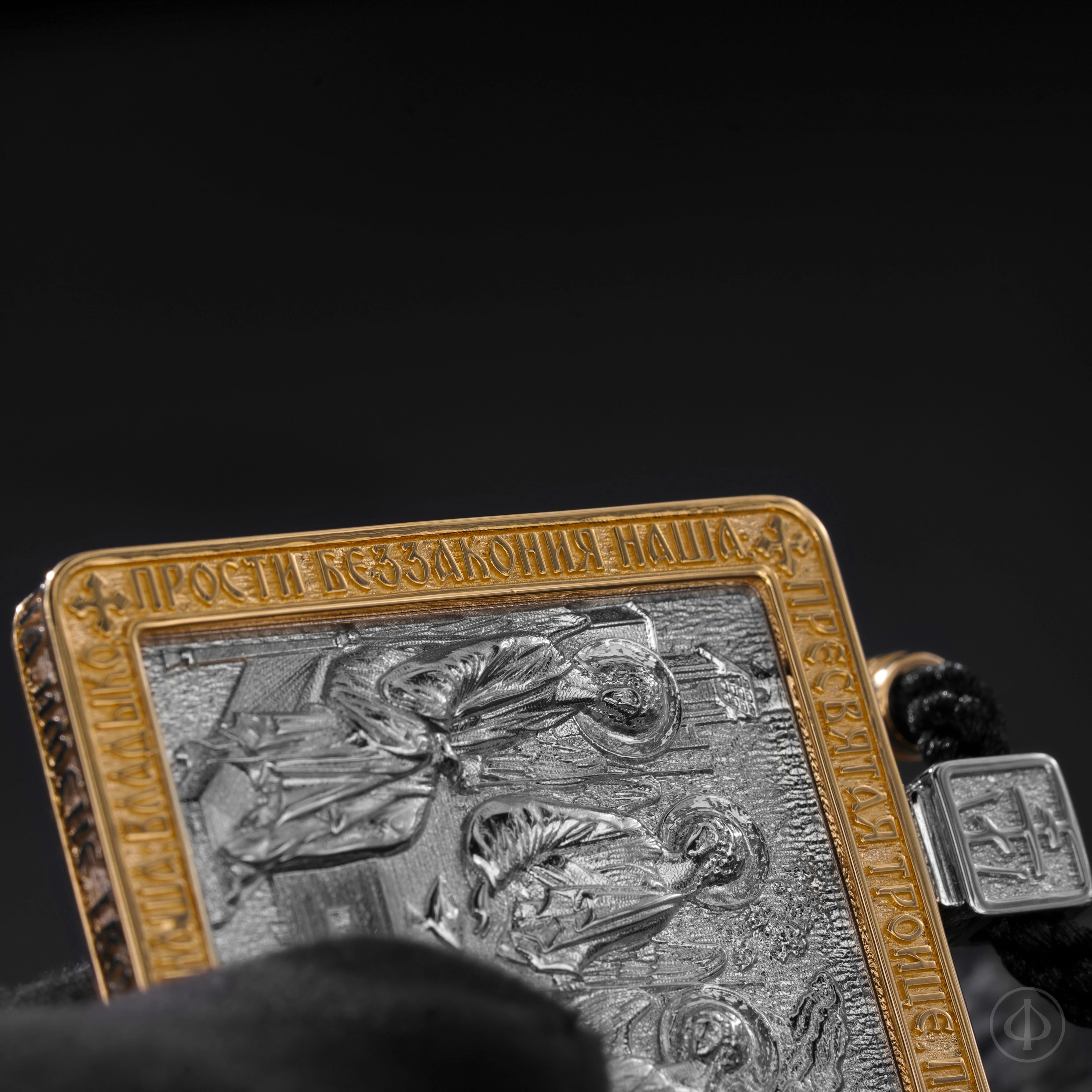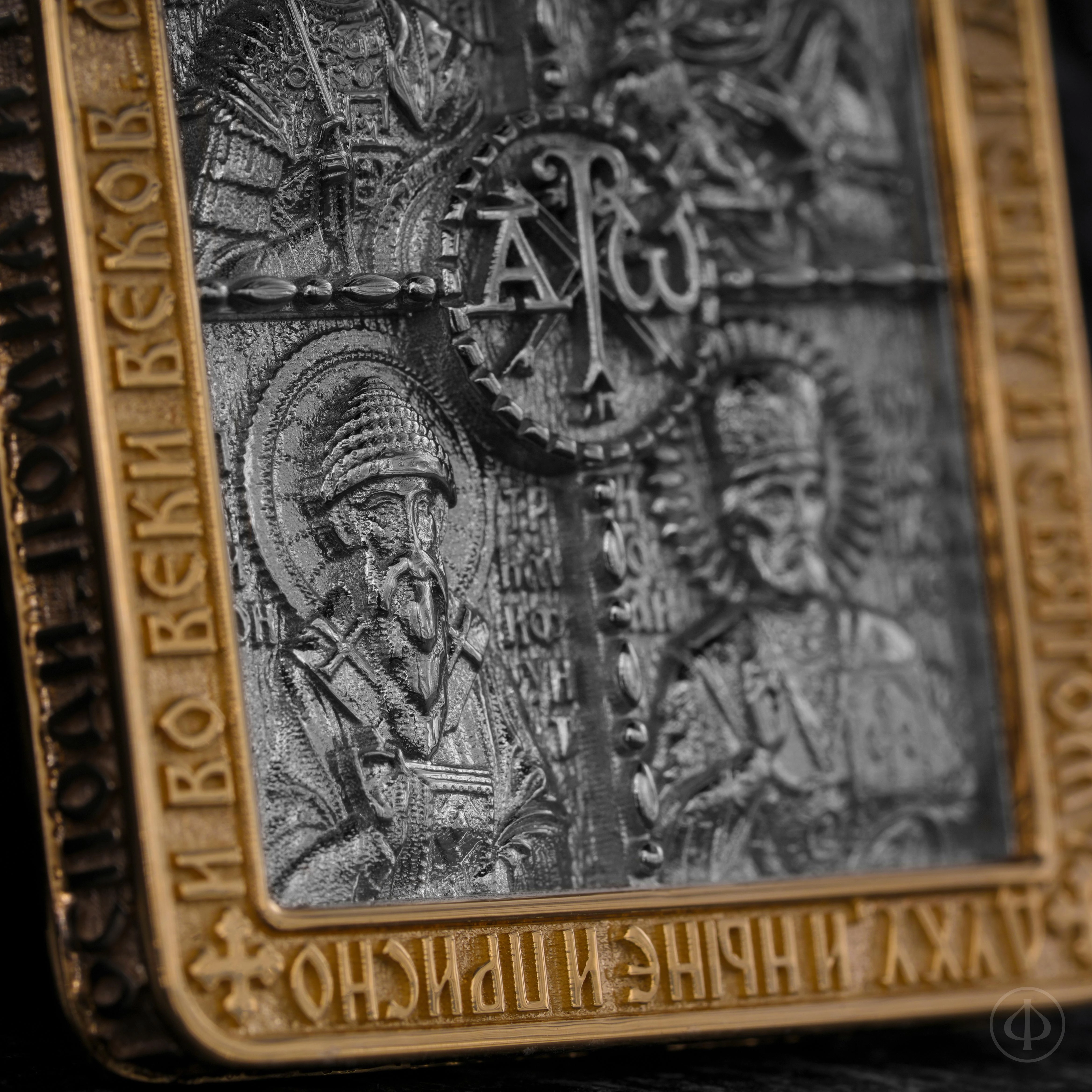 Сочетание жёлтого и белого золота подчёркивает глубину рельефа и выделяет центральные элементы. Оборотная сторона дополняет замысел образами почитаемых святых, раскрывая тему заступничества и духовной защиты.