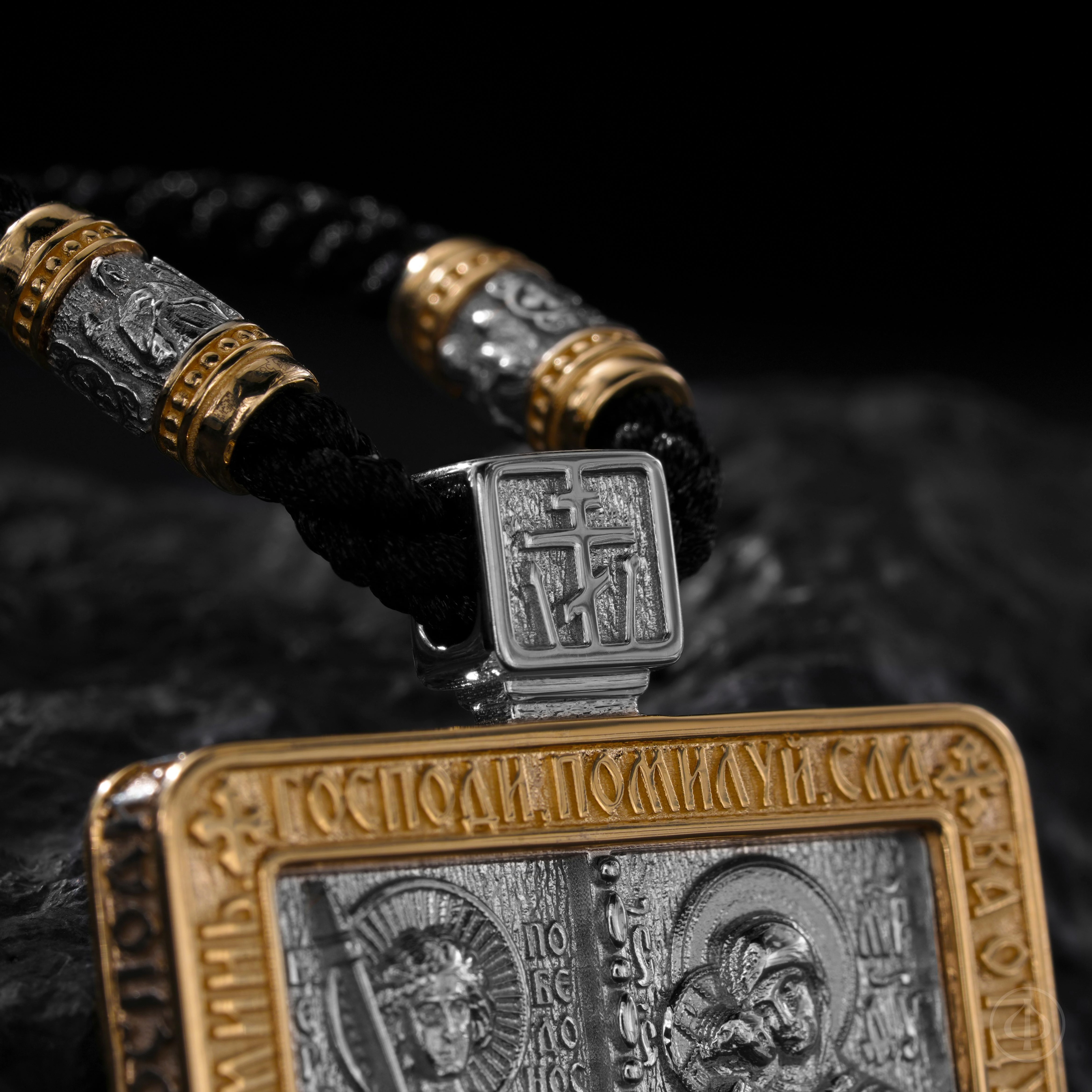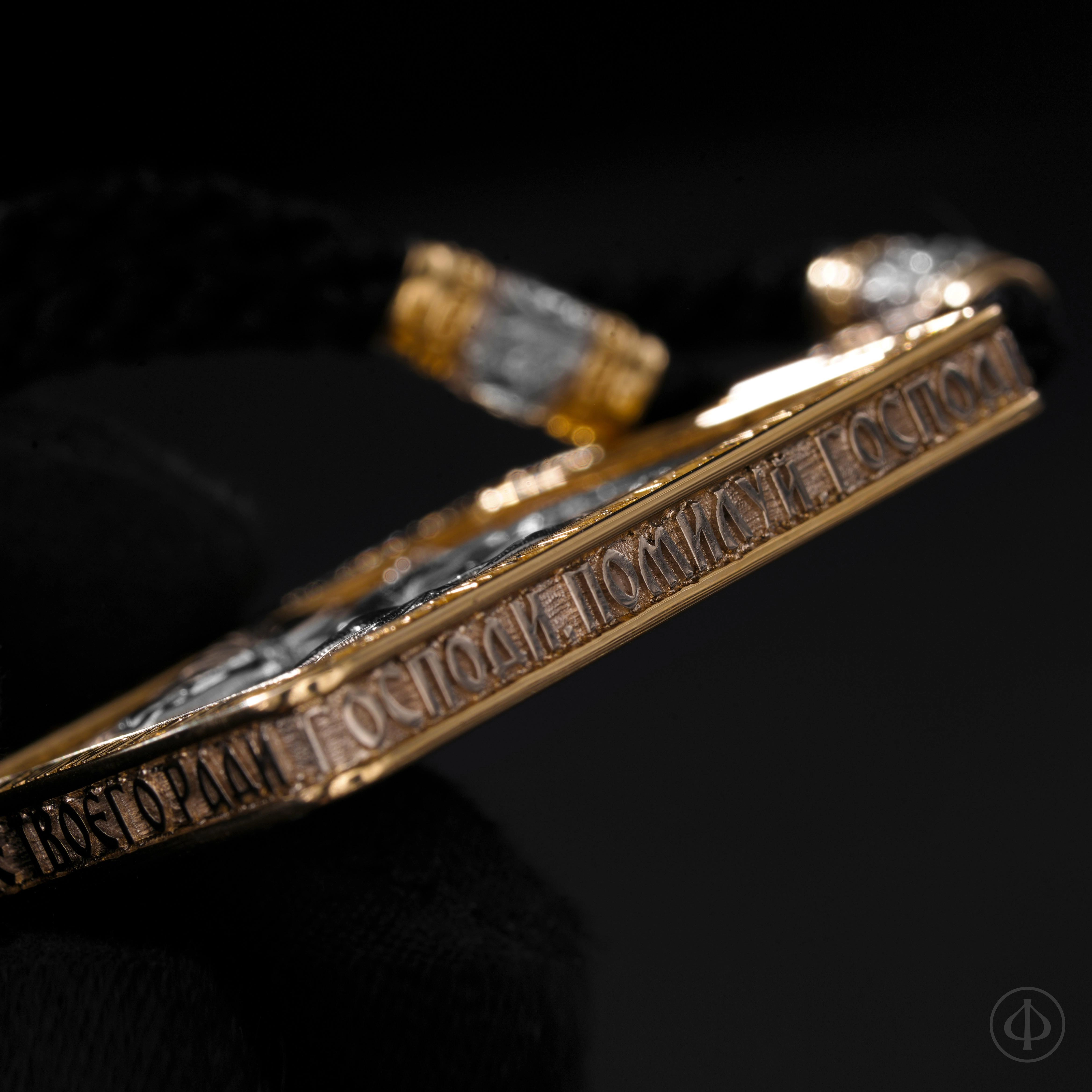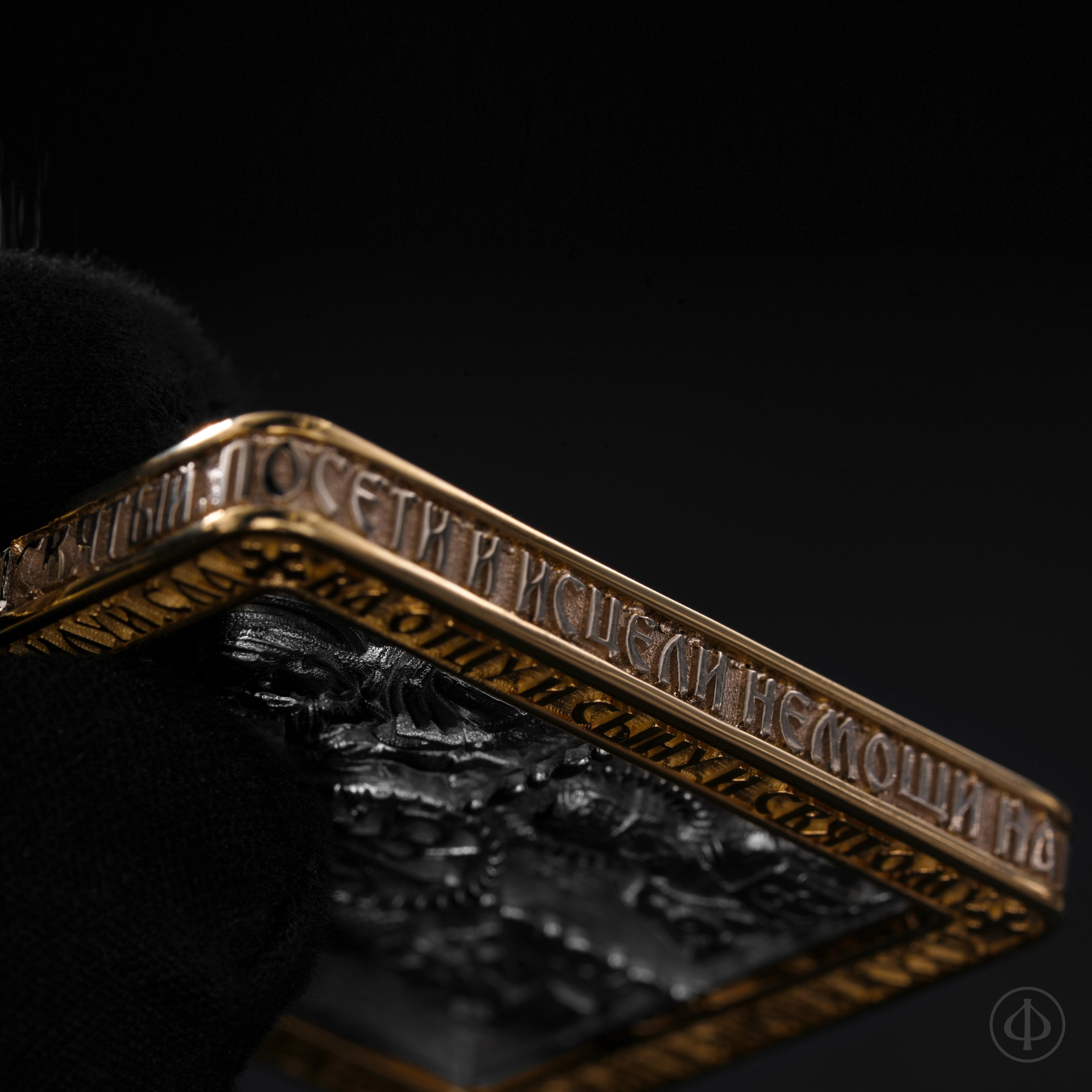 Молитвенные строки, проходящие по торцу, объединяют обе стороны в единое целое, превращая изделие в нательный символ веры — не декоративный, а содержательный.