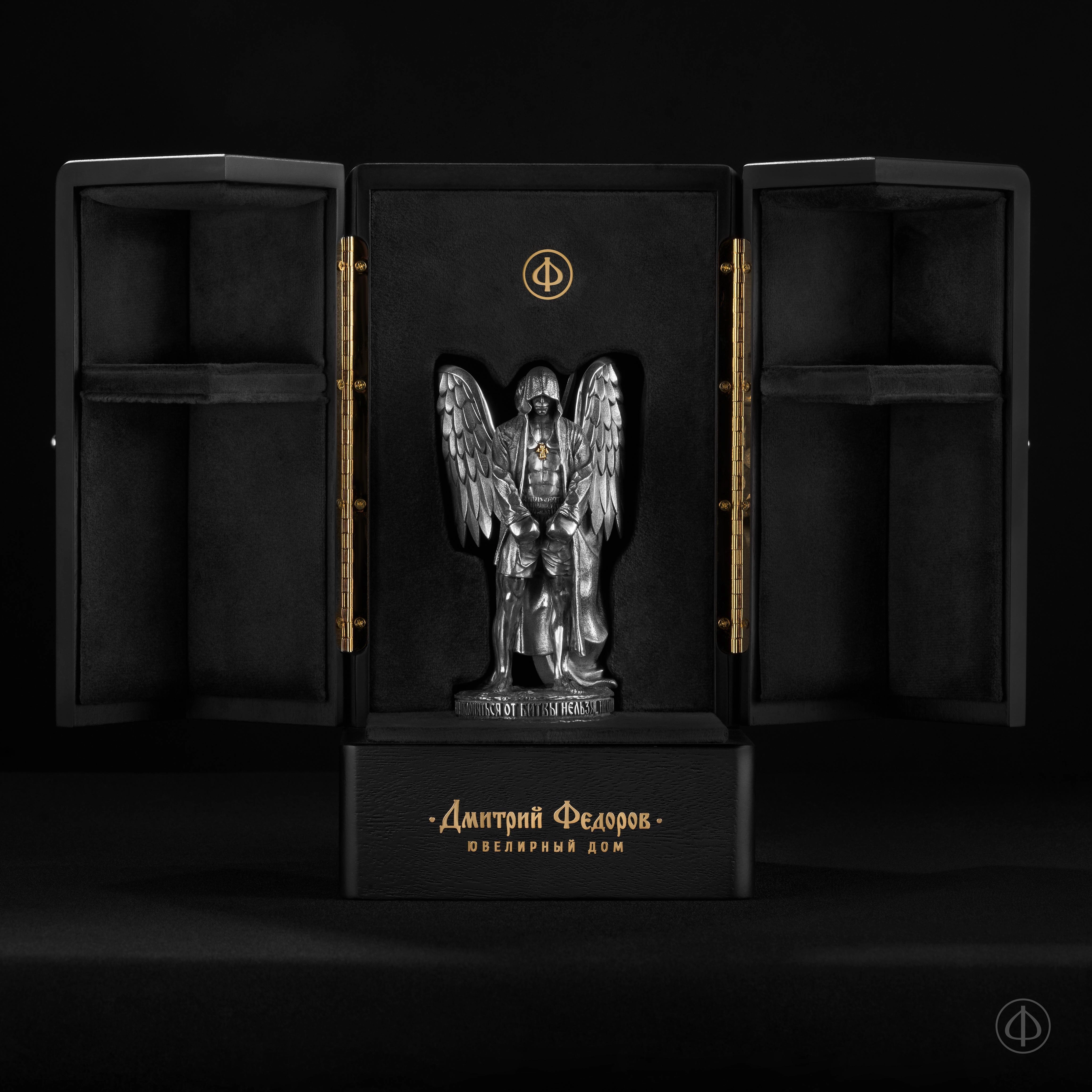 В композиции — спортсмен в спокойной, собранной стойке. За его спиной раскрываются крылья Архангела Михаила — небесного защитника и воина света. Этот образ говорит о главном: за каждым человеком стоит его ангел-хранитель, источник поддержки, мужества и тихой силы.
