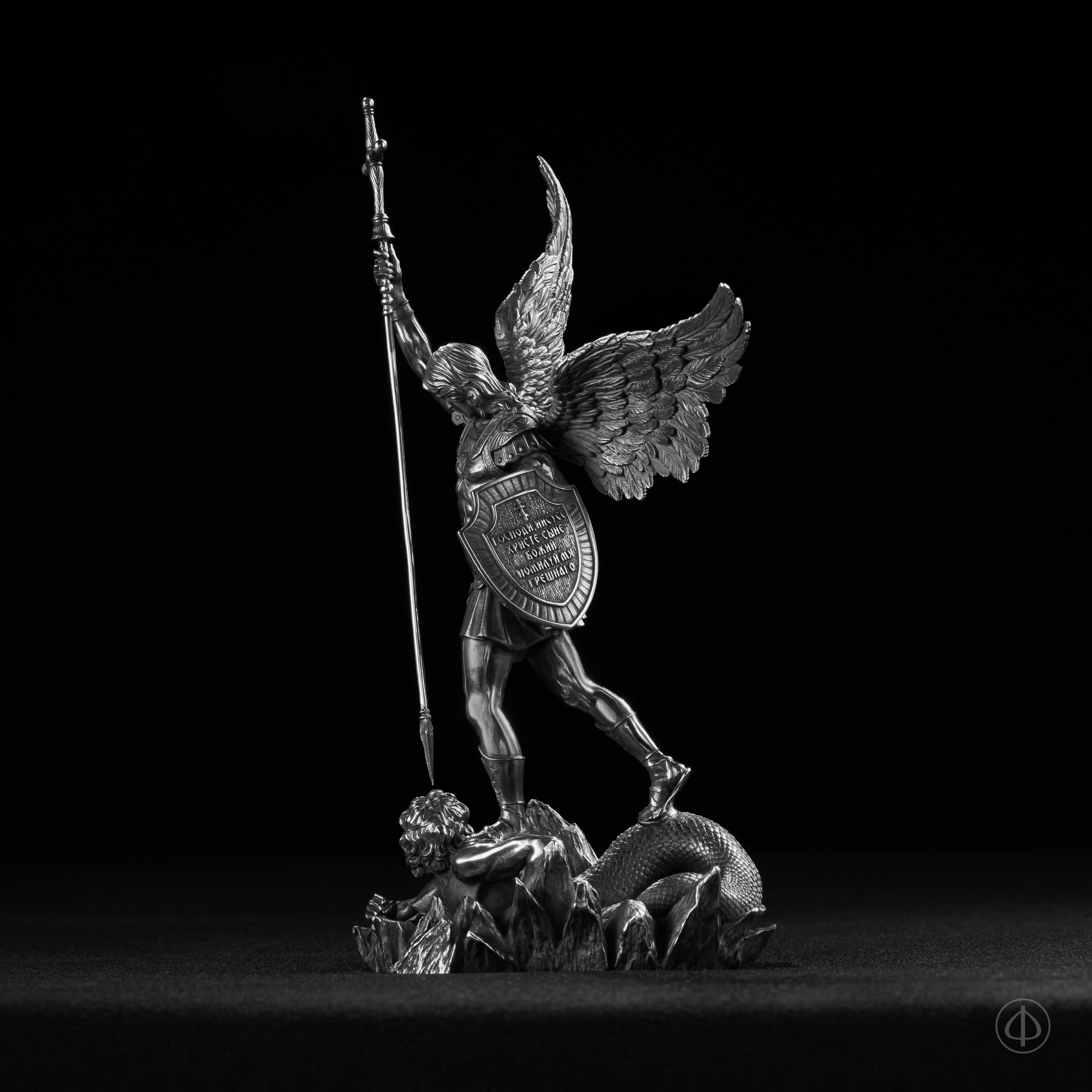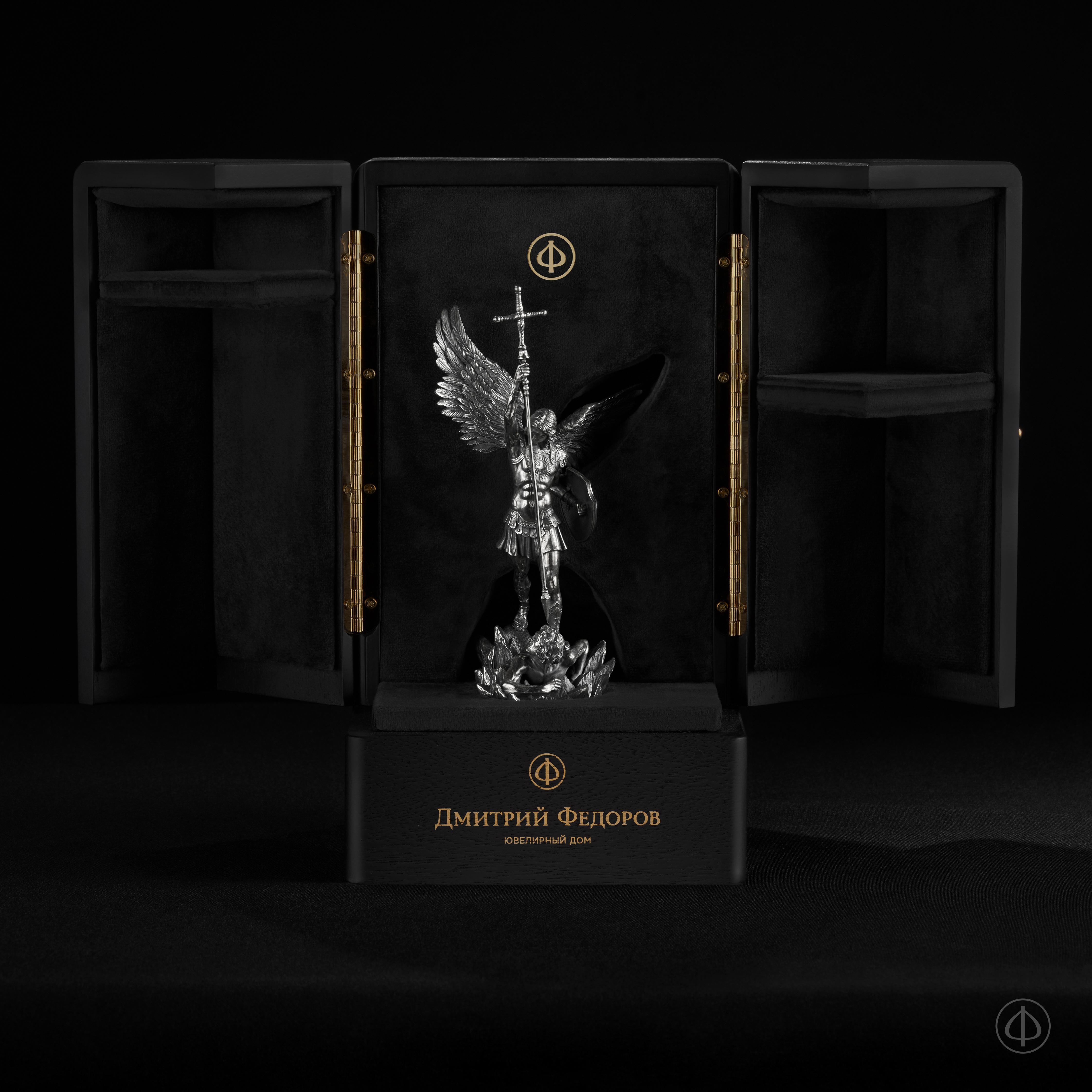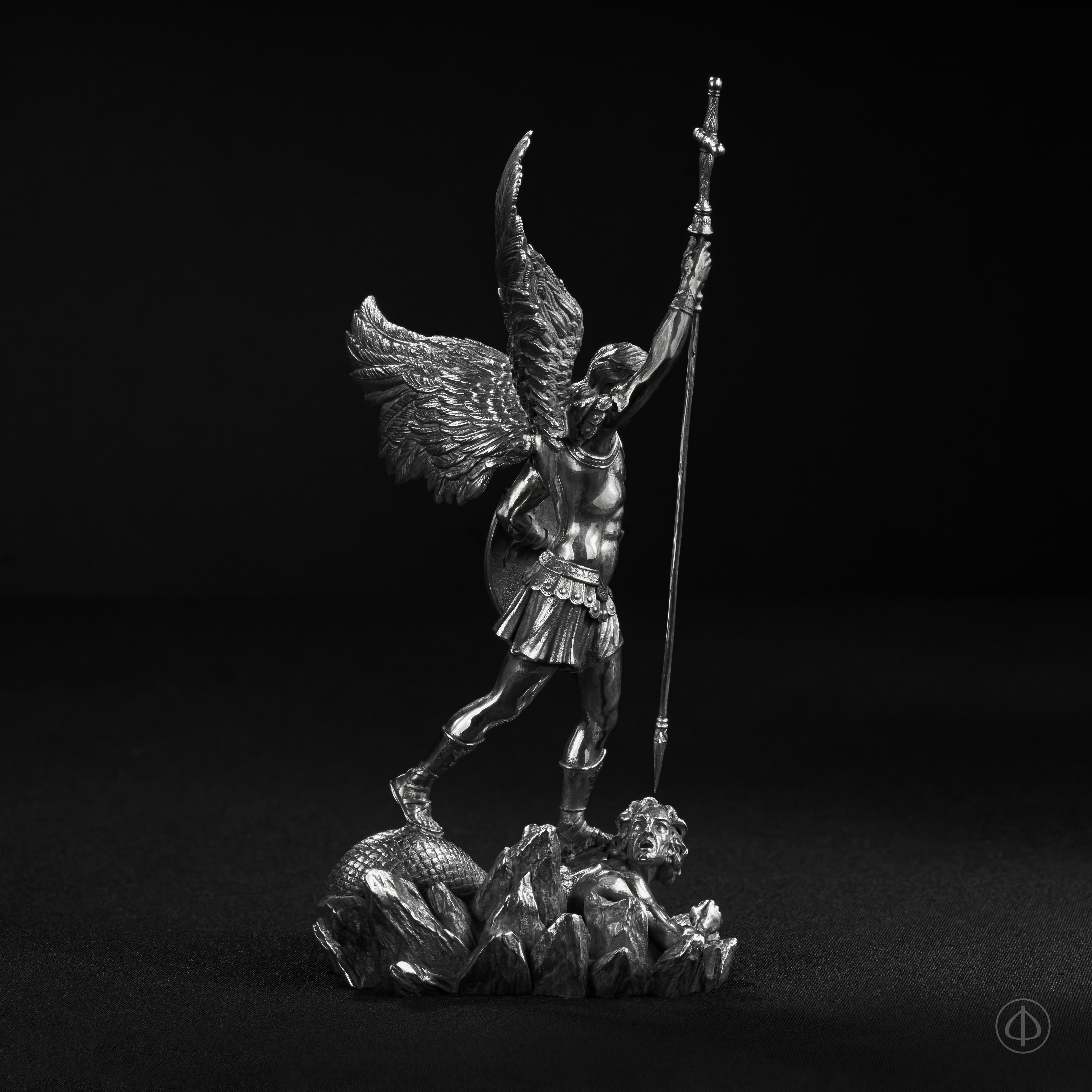- На статуэтке изображен Архангел Михаил, рассекающий копьем дьявола,