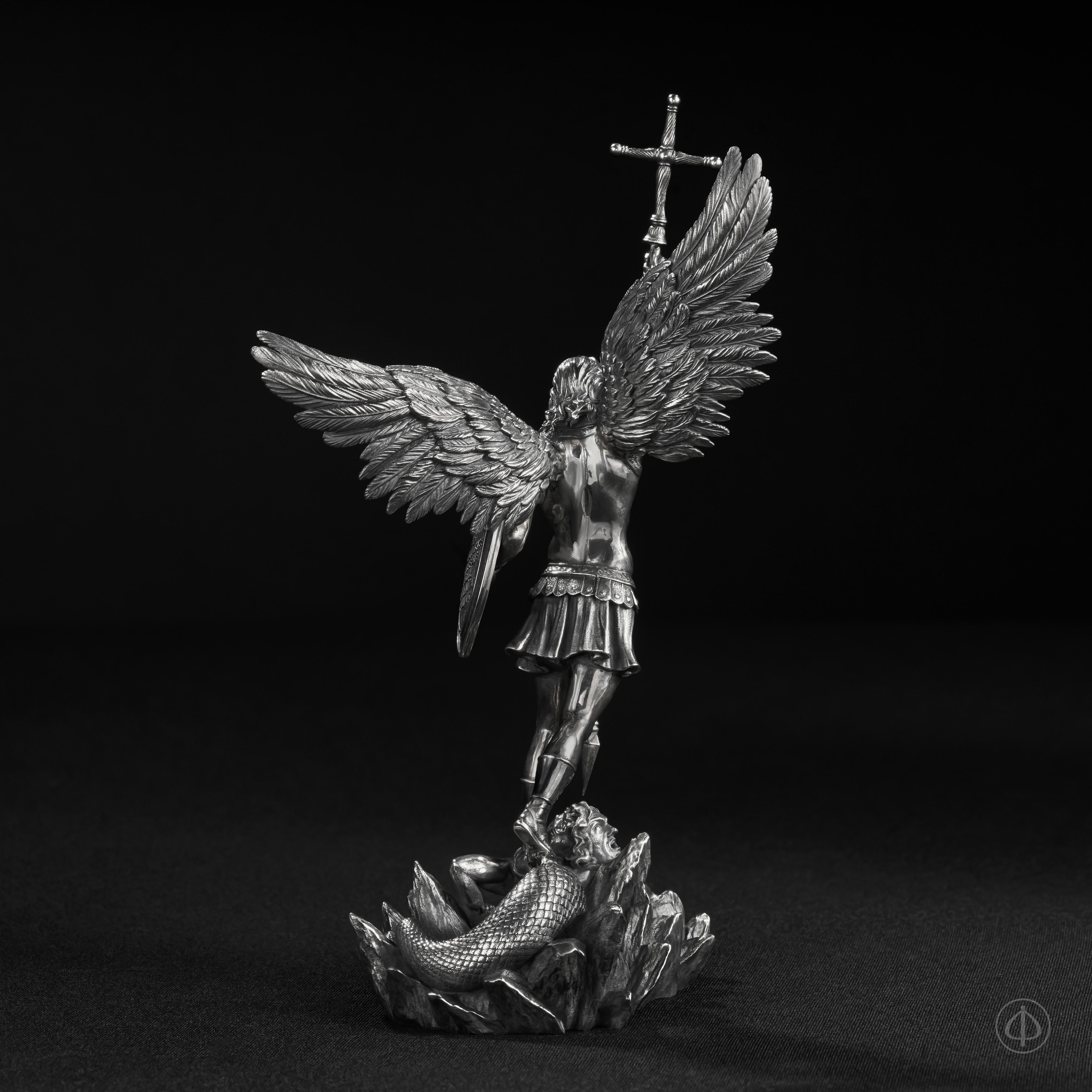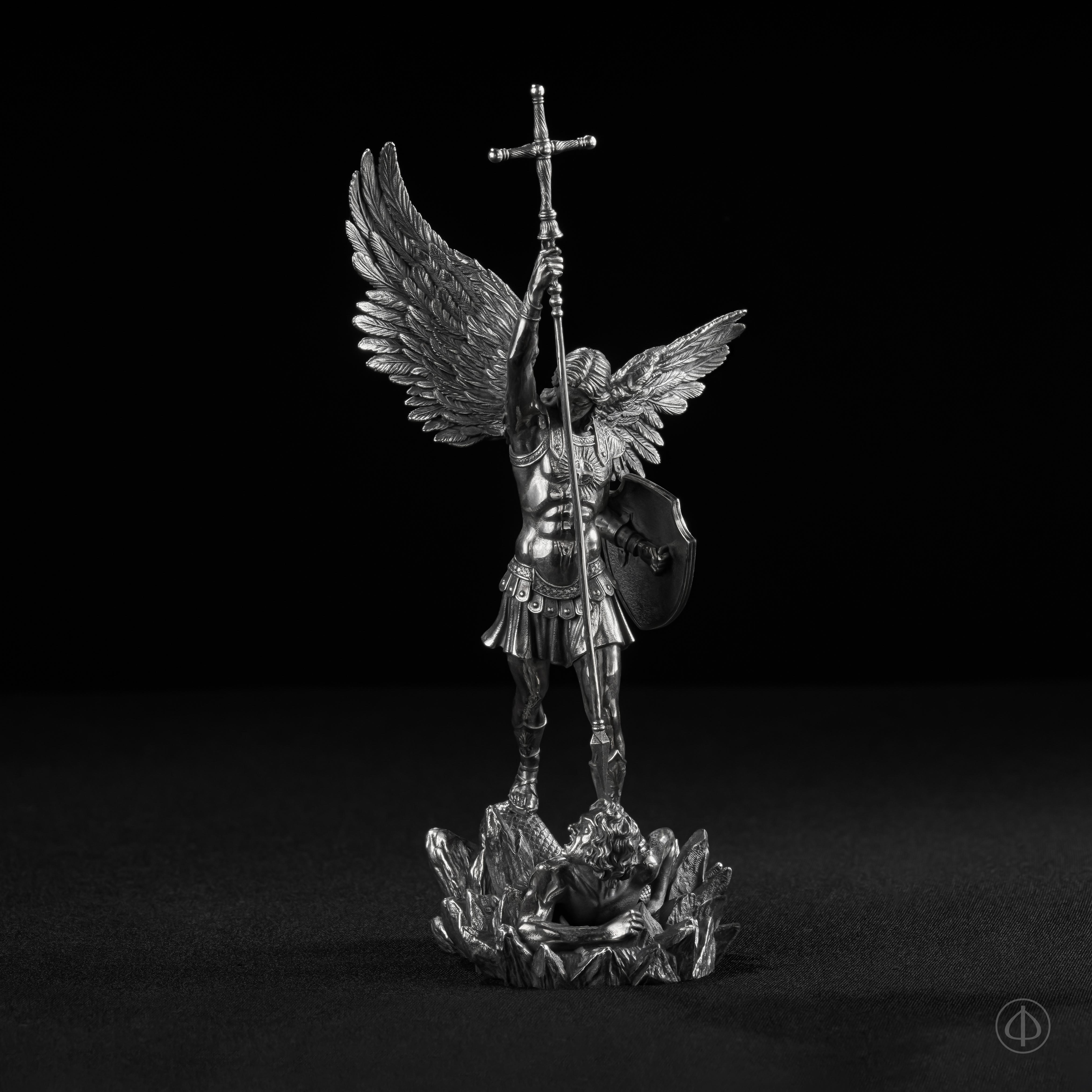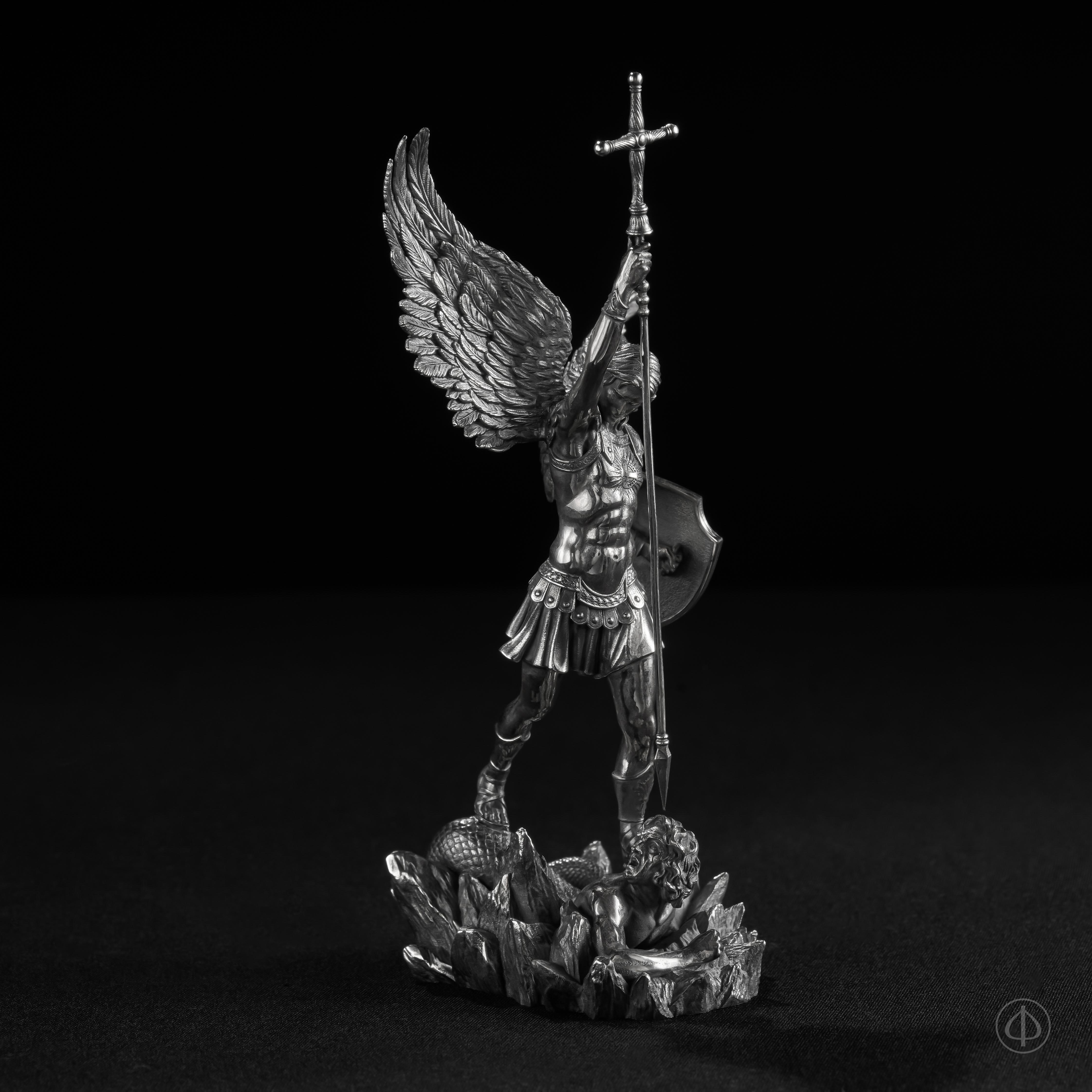- На статуэтке изображен Архангел Михаил, рассекающий копьем дьявола,