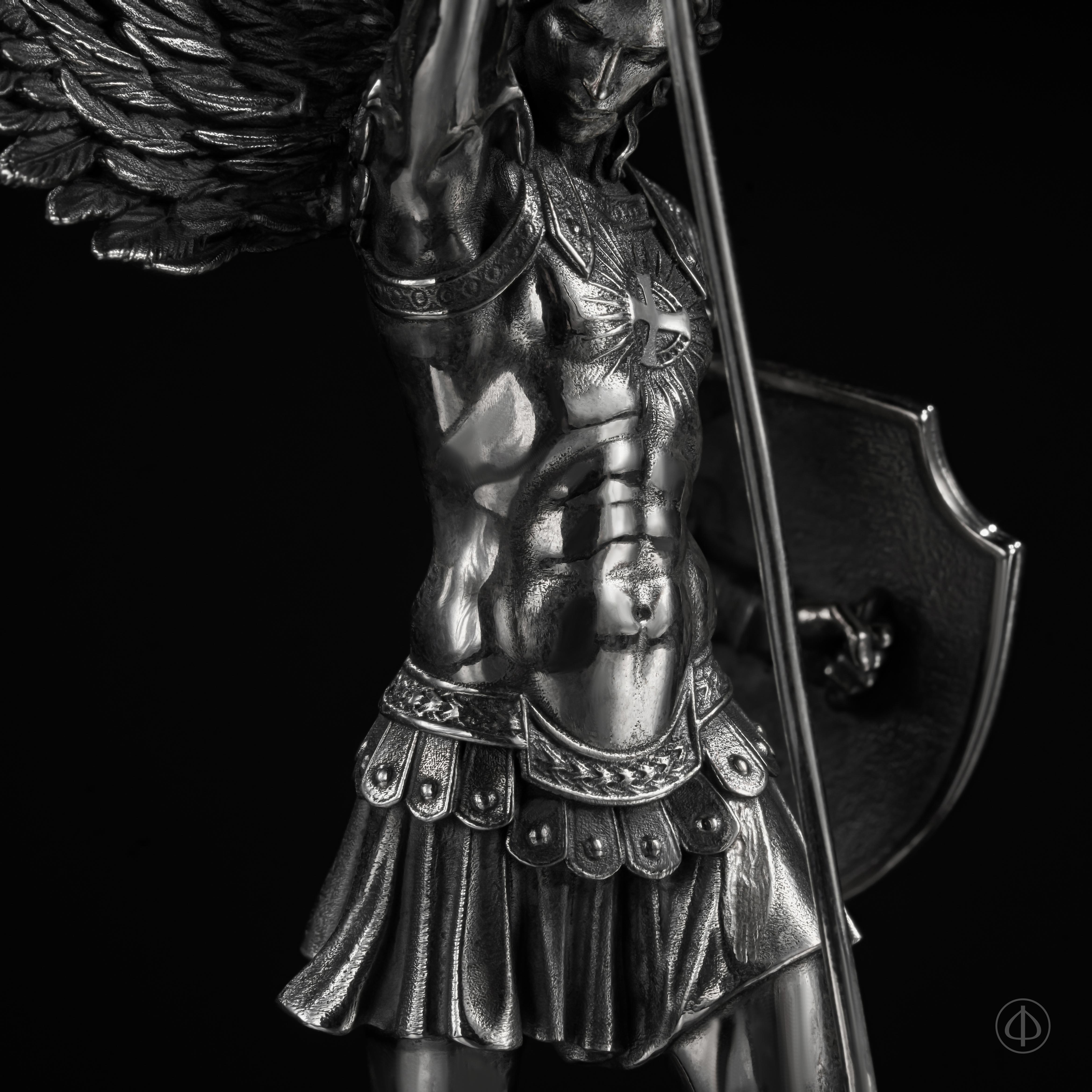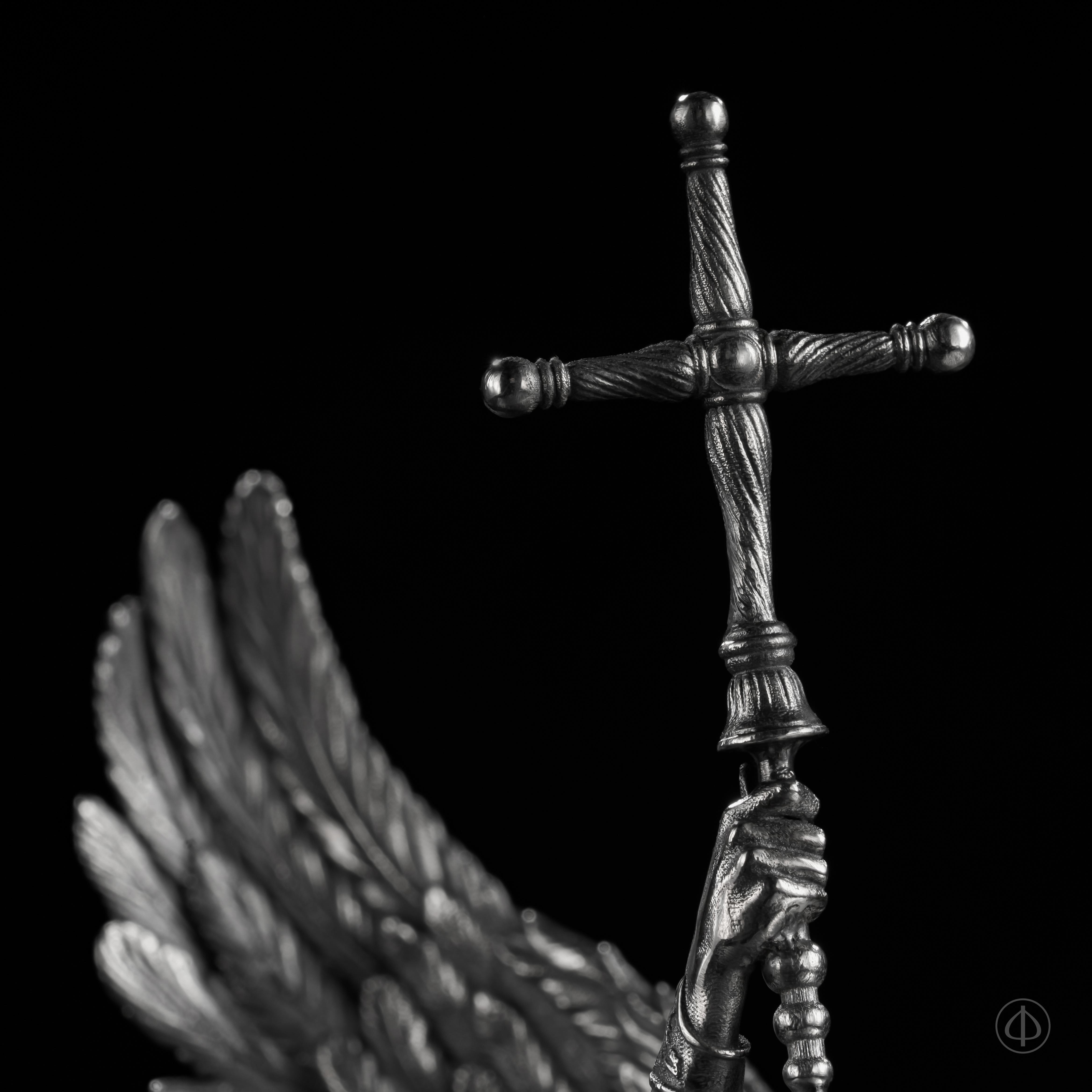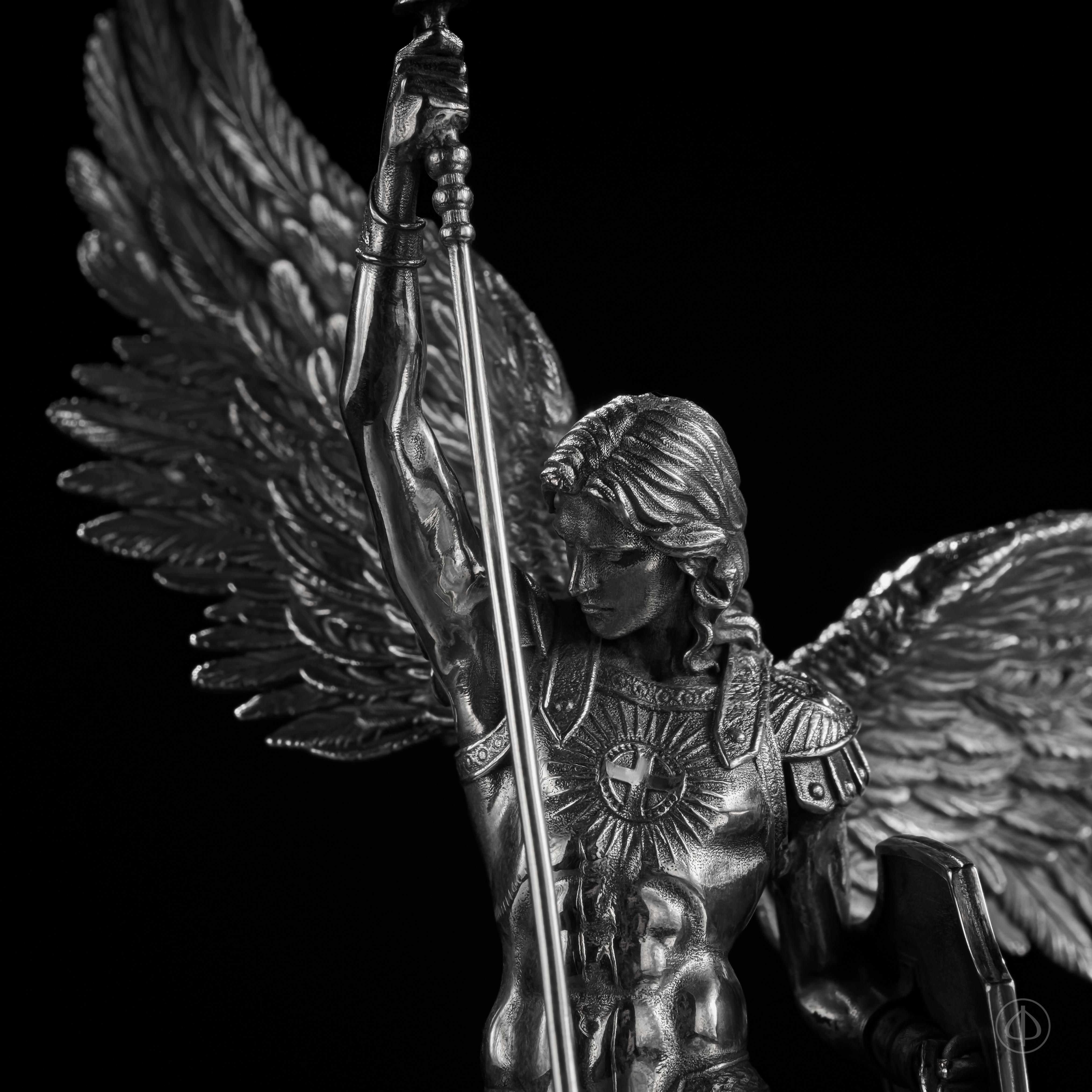 Архангел Михаил как предводитель Господнего воинства изображен в моменте победы над дьяволом, который символизирует собой роль искусителя. Статуэтка из драгоценного металла "Духовная брань" служит символом веры не только в Бога, но и в самого себя, а также является напоминанием о борьбе с собственными соблазнами и искушениями.