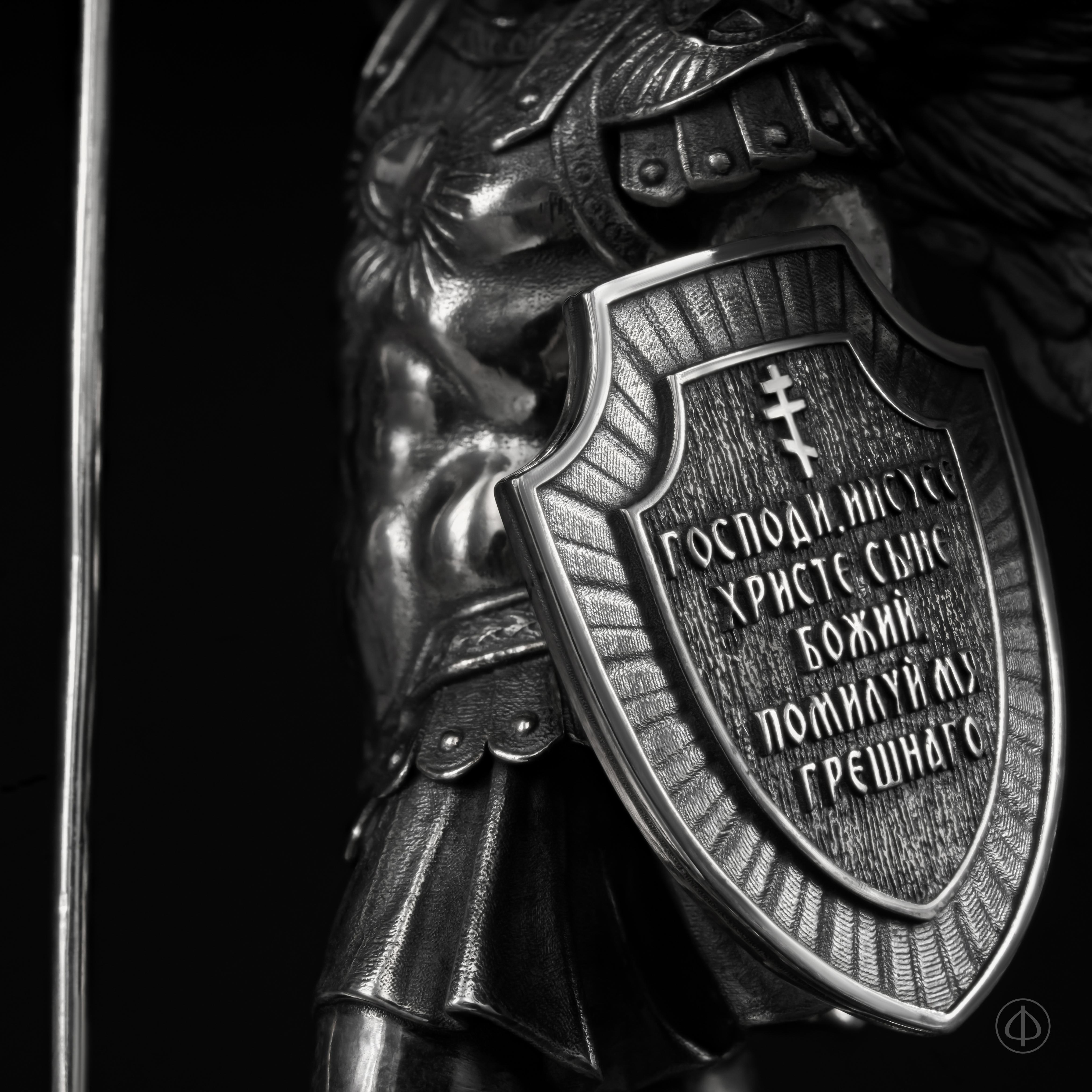- На защитном щите надпись молитвы «Господи Иисусе Христе, Сыне Божий, помилуй мя грешнаго».