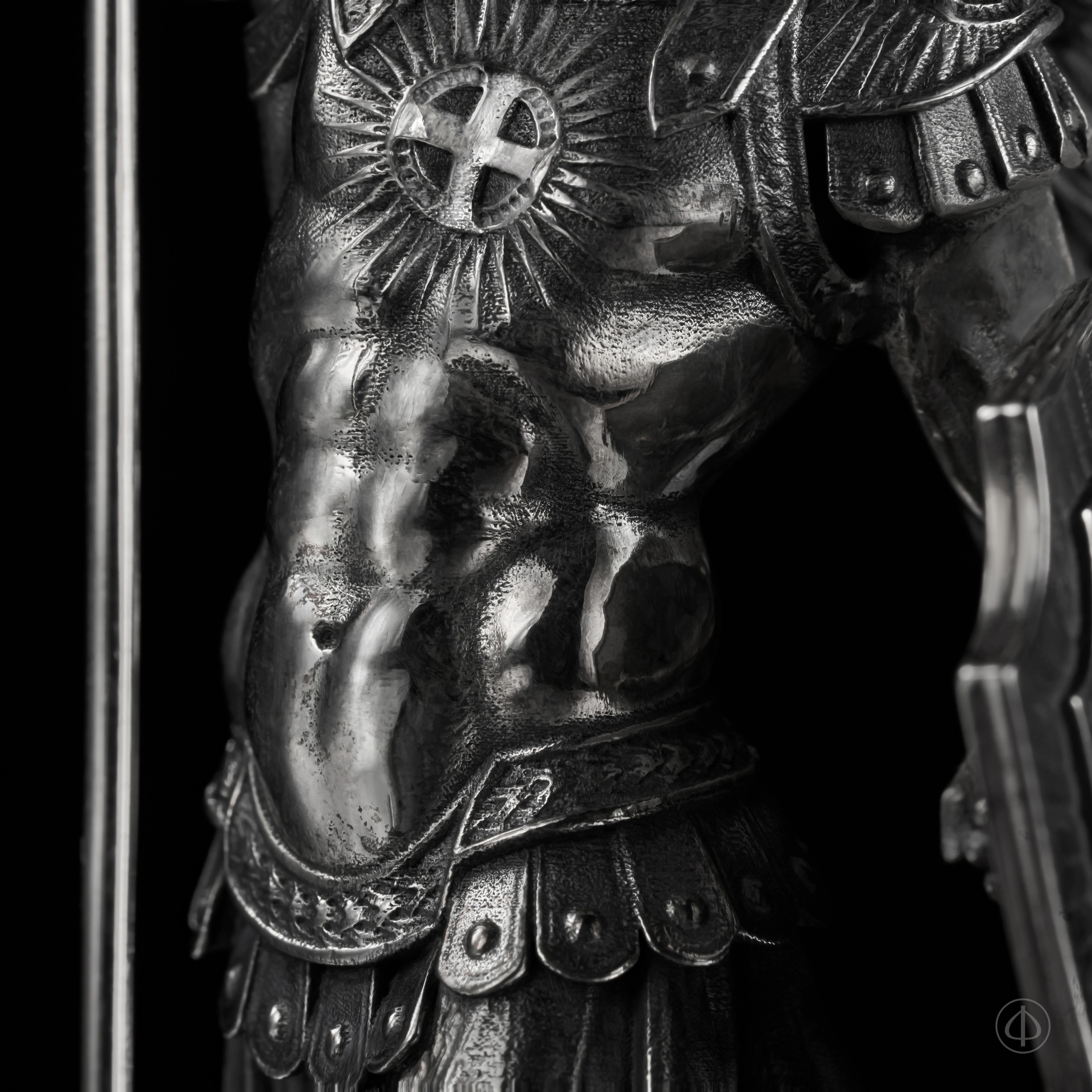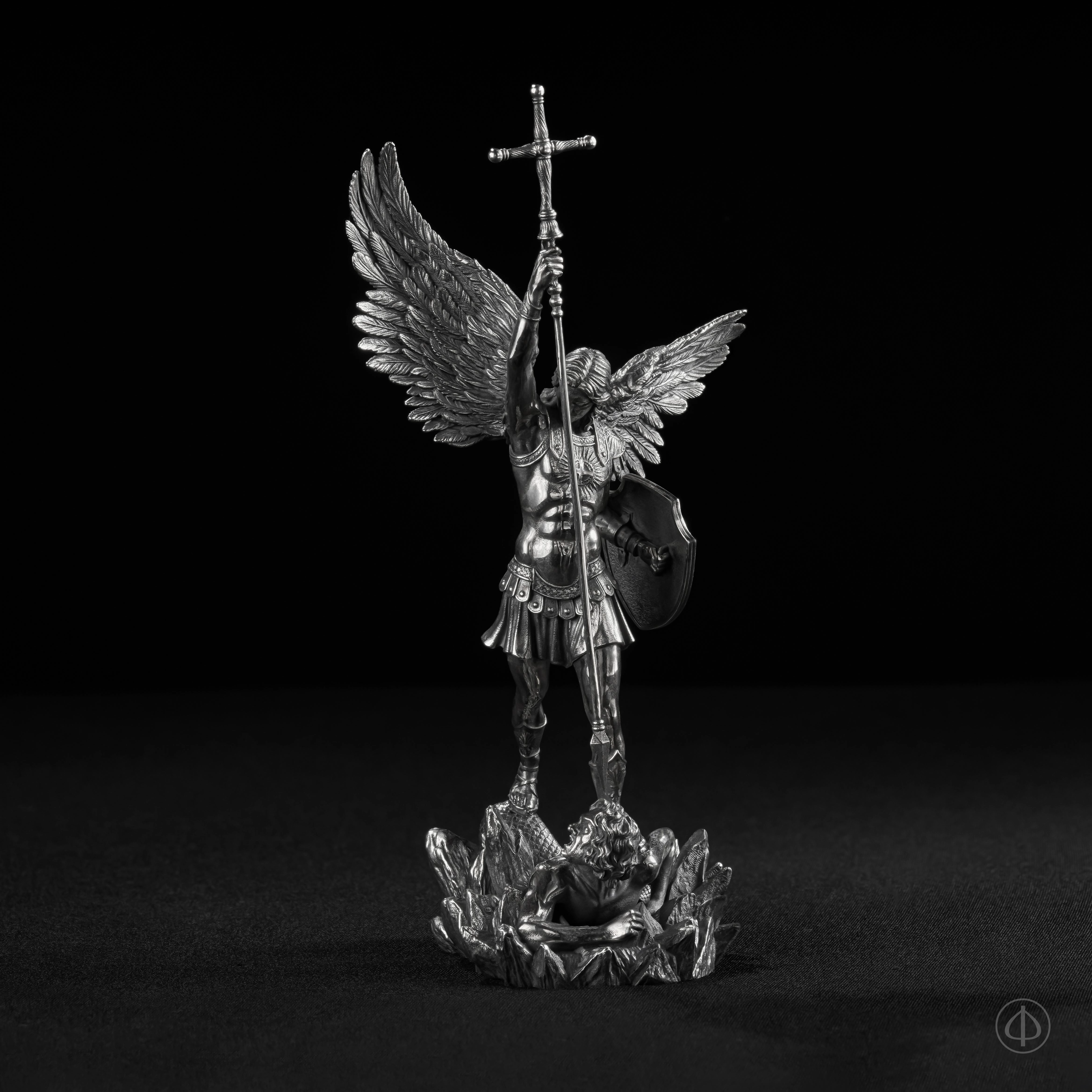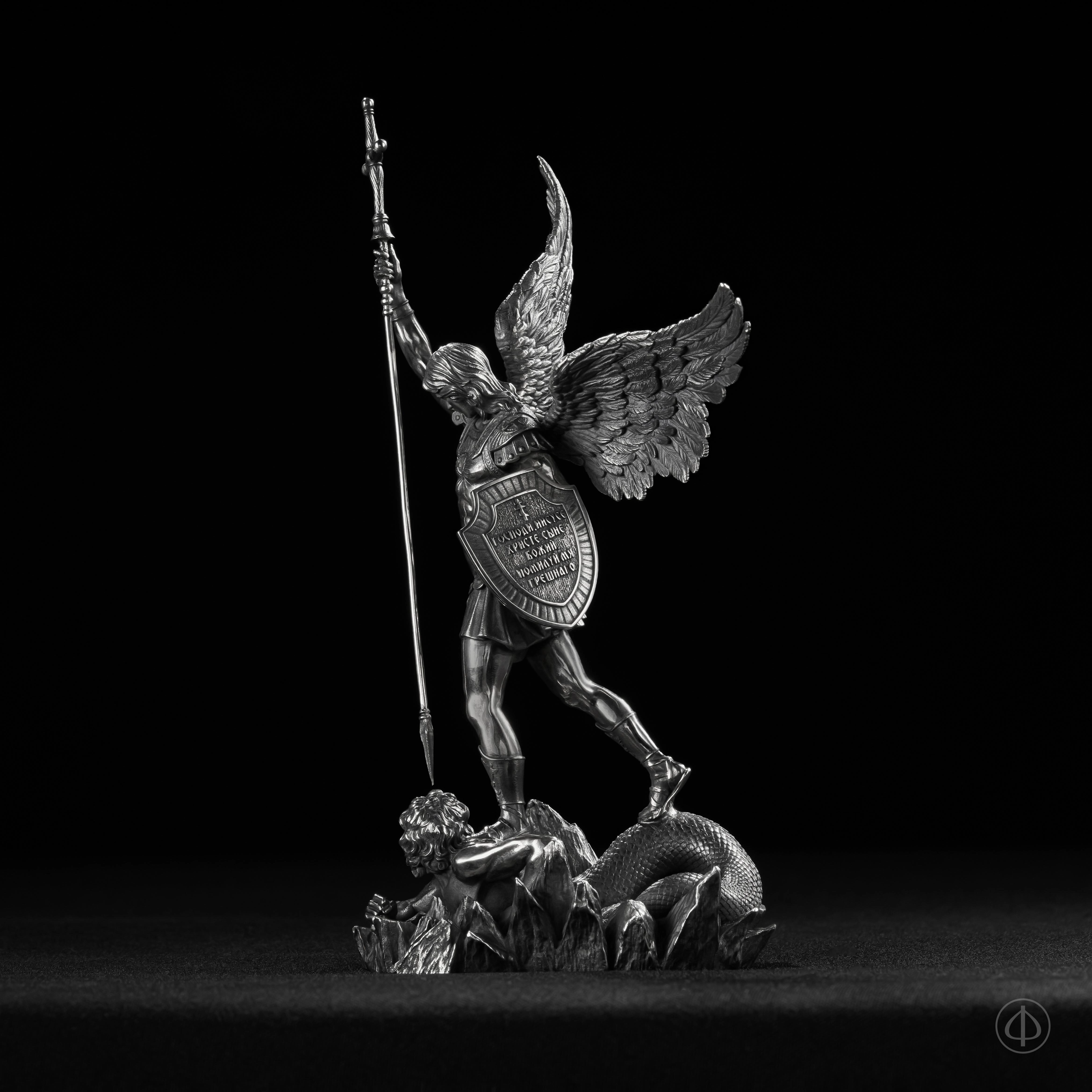 Исполнение подчёркивает драматизм замысла. Каждая деталь проработана с ювелирной точностью: выразительное лицо Архангела, пластика доспехов и складок одежд, напряжённый силуэт крыльев, фигура поверженного дьявола. Фактурная отделка и чернение серебра создают глубокую светотень и усиливают ощущение движения.