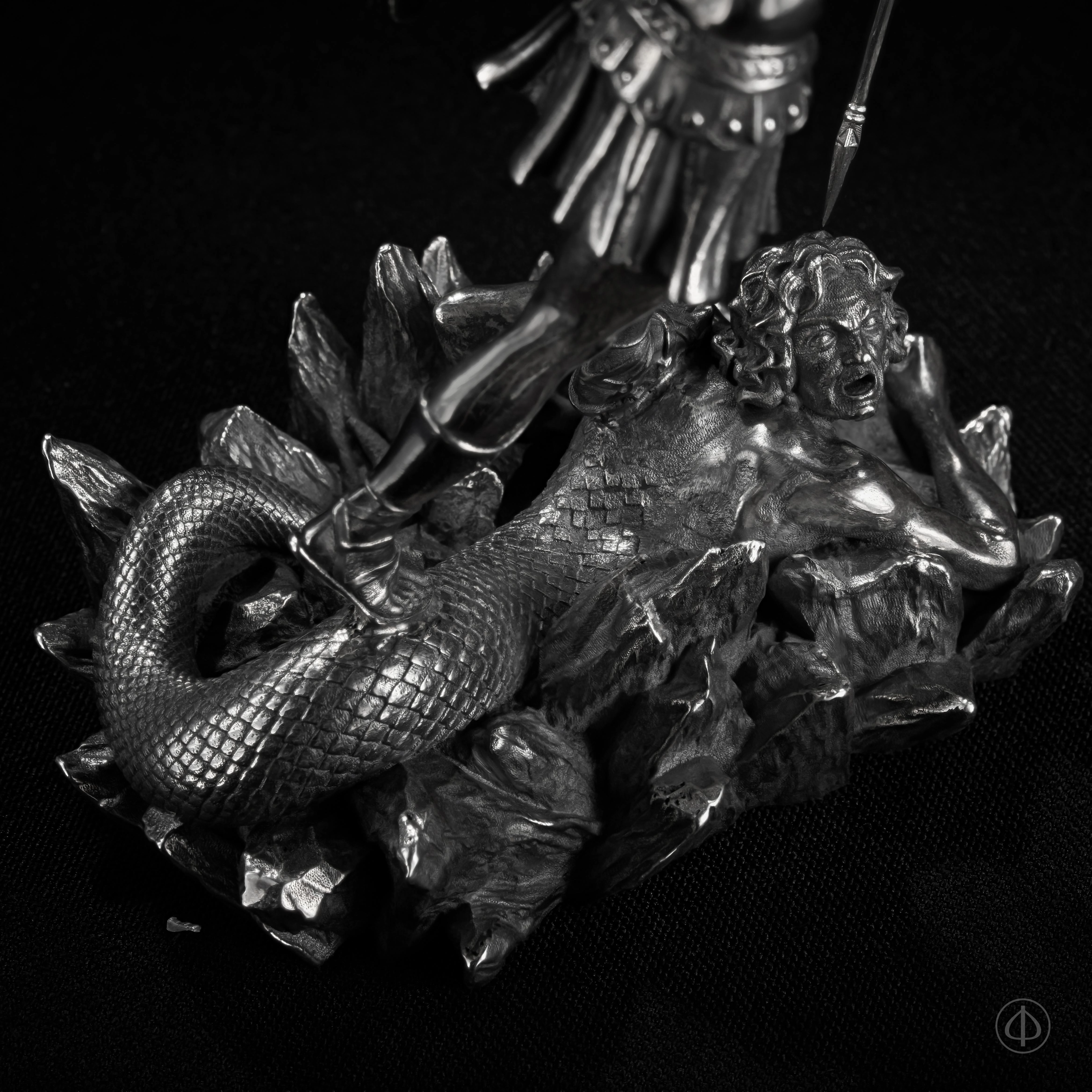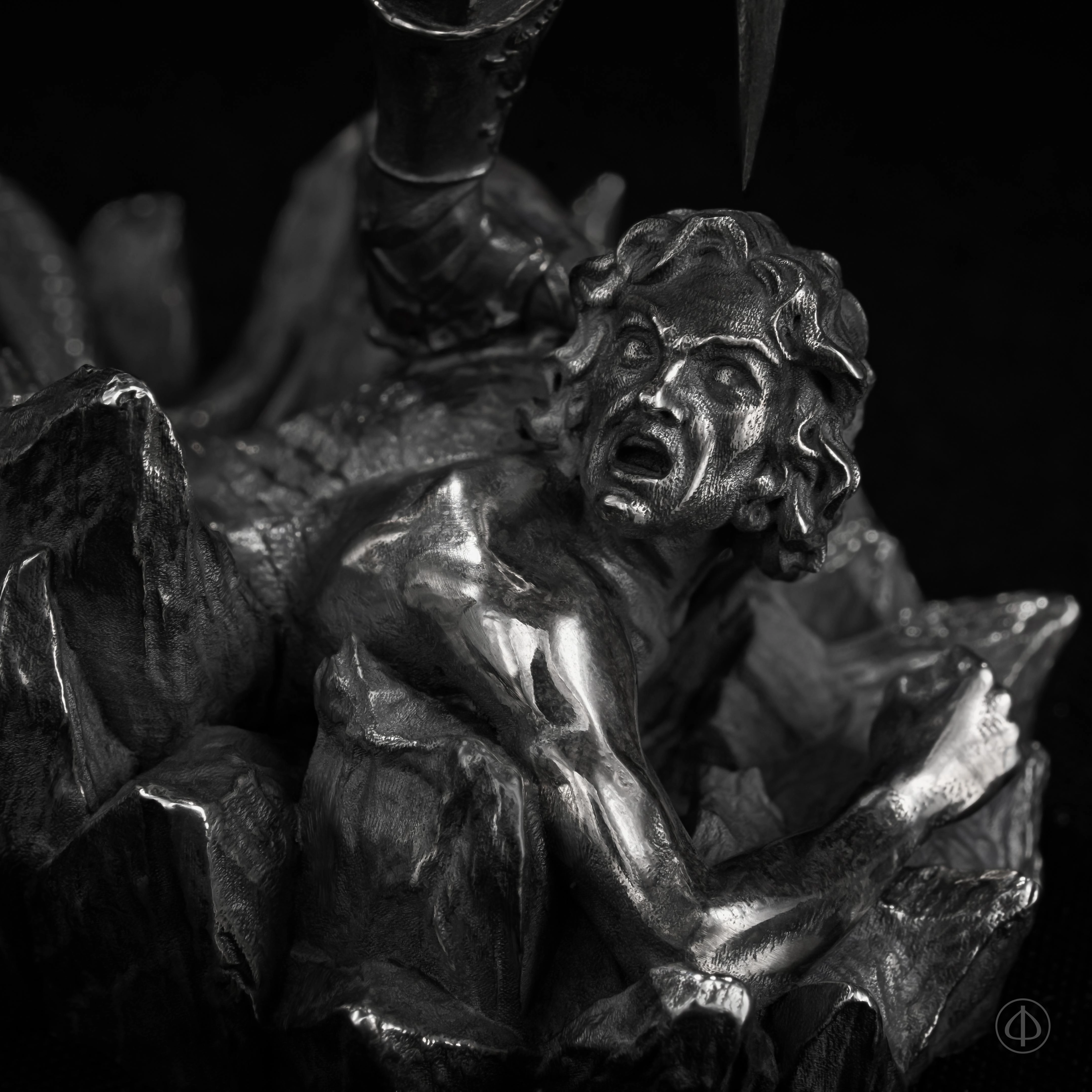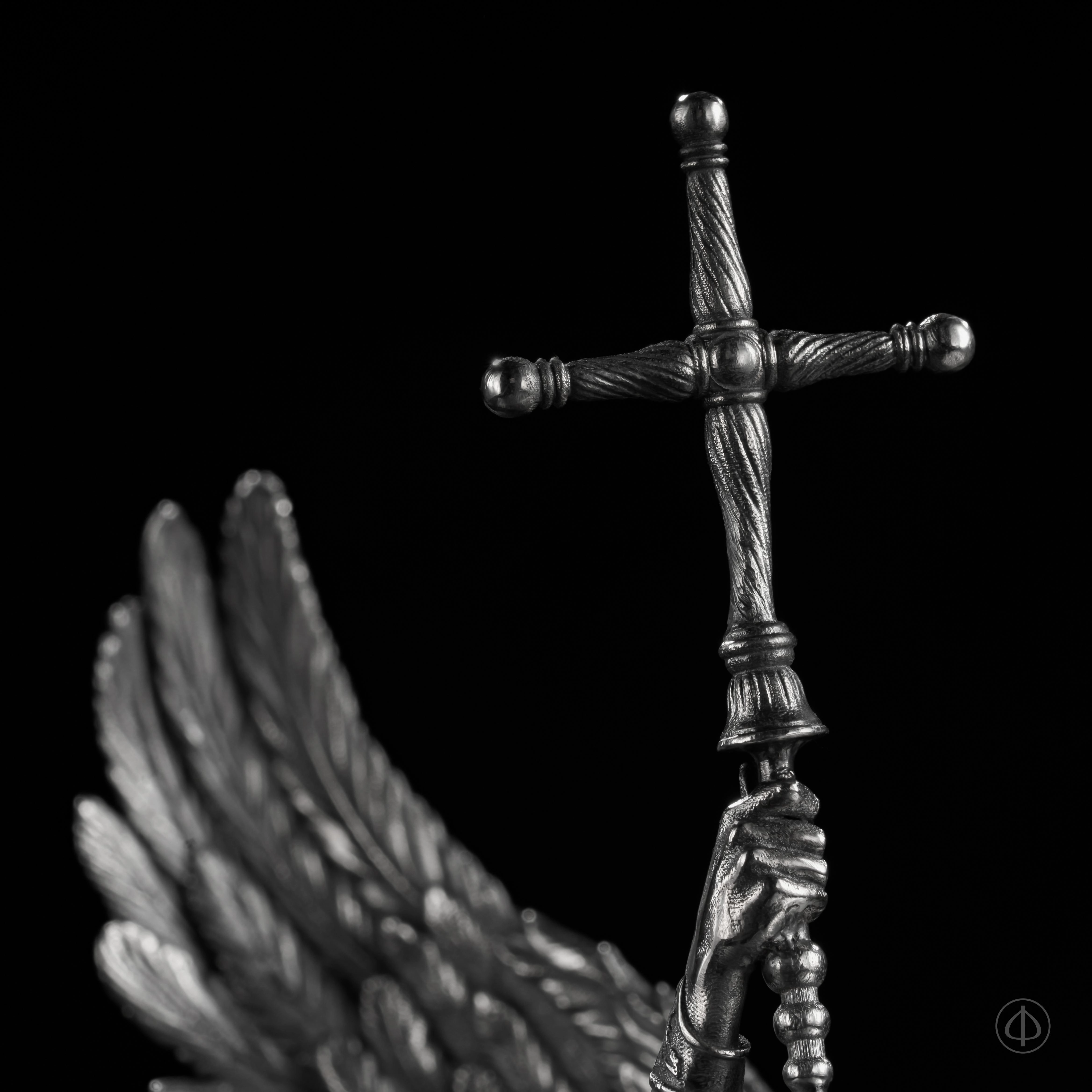 Исполнение подчёркивает драматизм замысла. Каждая деталь проработана с ювелирной точностью: выразительное лицо Архангела, пластика доспехов и складок одежд, напряжённый силуэт крыльев, фигура поверженного дьявола. Фактурная отделка и чернение серебра создают глубокую светотень и усиливают ощущение движения.