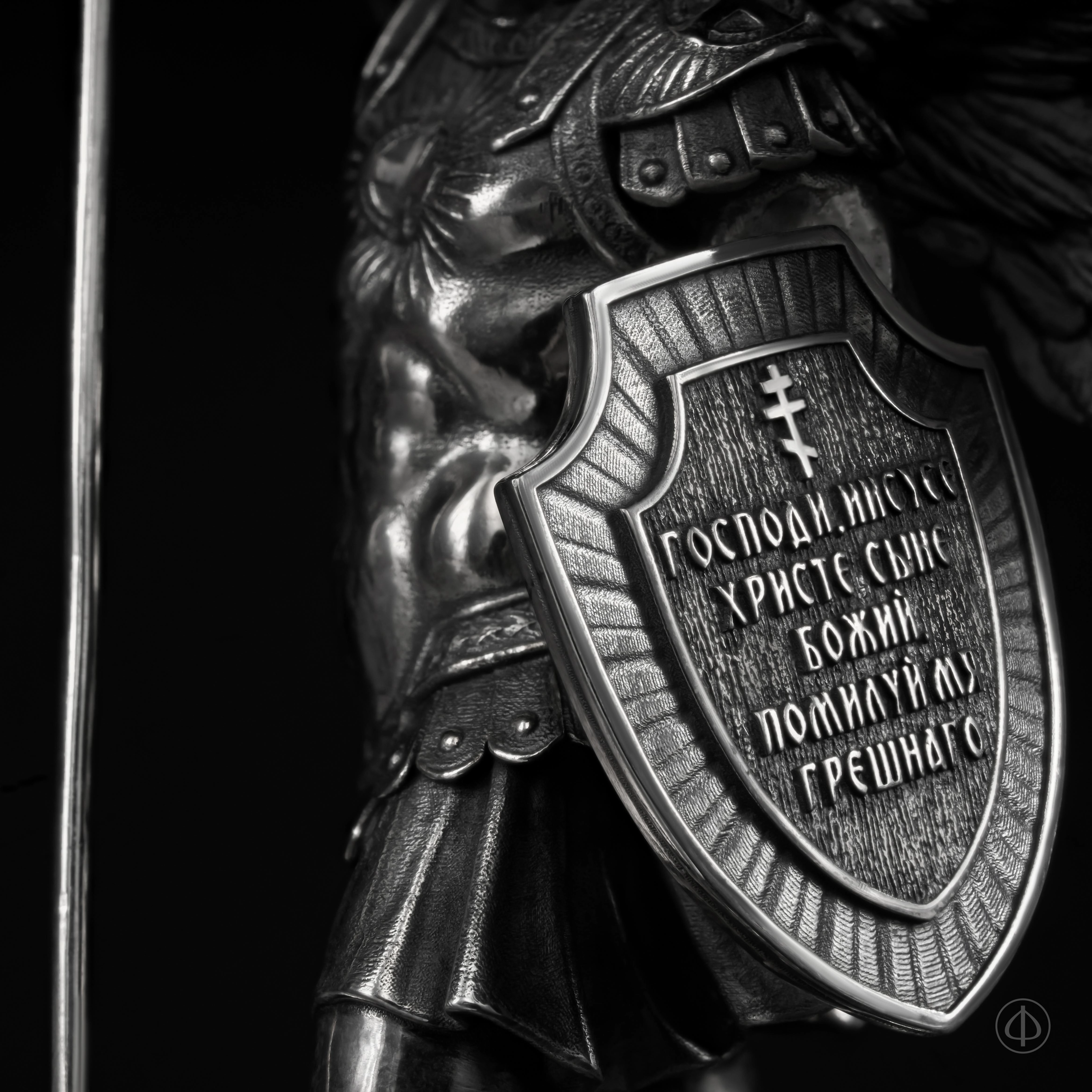 На щите Архангела начертаны слова Иисусовой молитвы: «Господи Иисусе Христе, Сыне Божий, помилуй мя грешнаго». Молитвенное обращение придаёт композиции особую глубину: победа достигается не только силой, но и смирением, не только решимостью, но и верностью Богу.