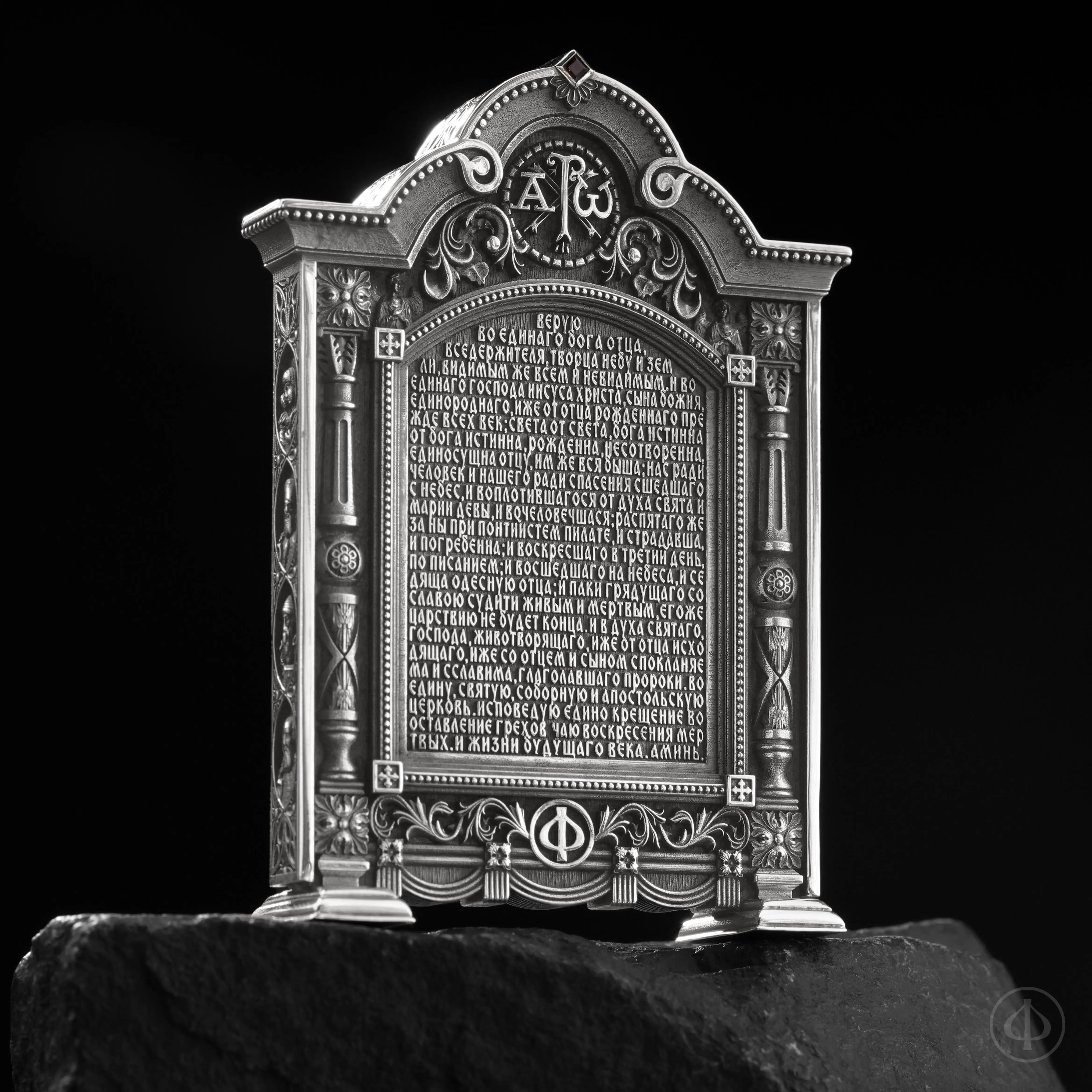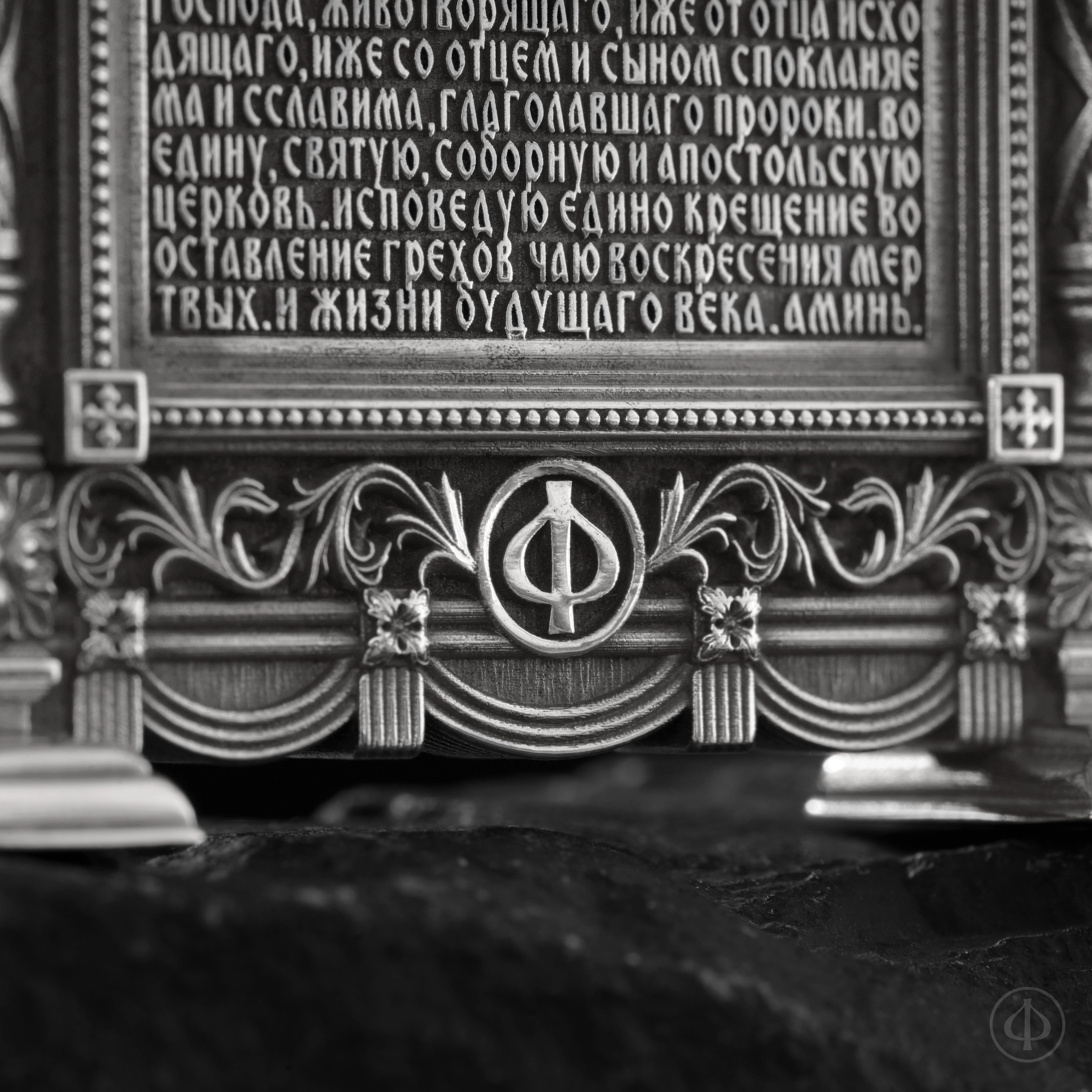 • вверху хризма – монограмма имени Христа с греческими буквы α и ω "Аз есмь Альфа и Омега",